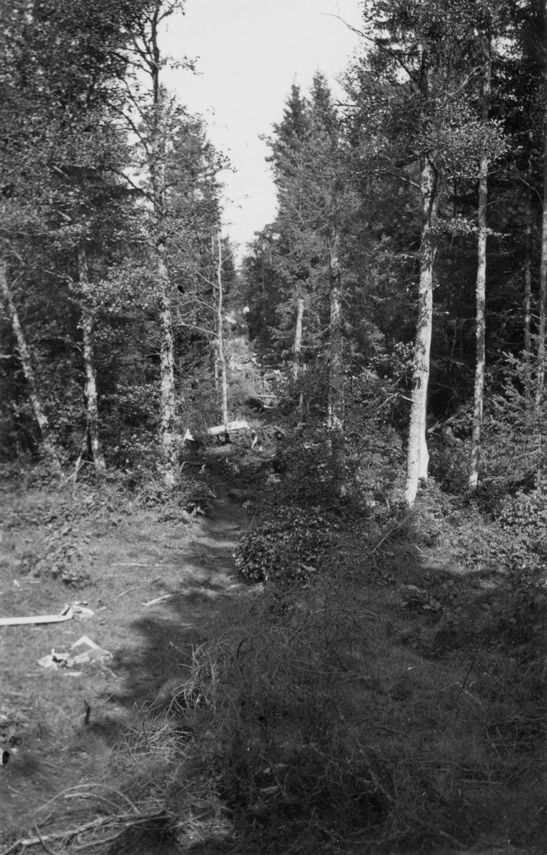 Nedslagssträcka i skogsparti med haveridelar från flygplan B 3 Junkers Ju 86K. Flygplanet är kraftigt tilltyglat och har slagits i småbitar.