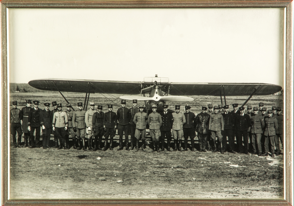 Grupporträtt. 1927-28 års flygelever med lärare på F 5 står framför ett flygplan på ett flygfält i Ljungbyhed 1928. Inramat foto.
