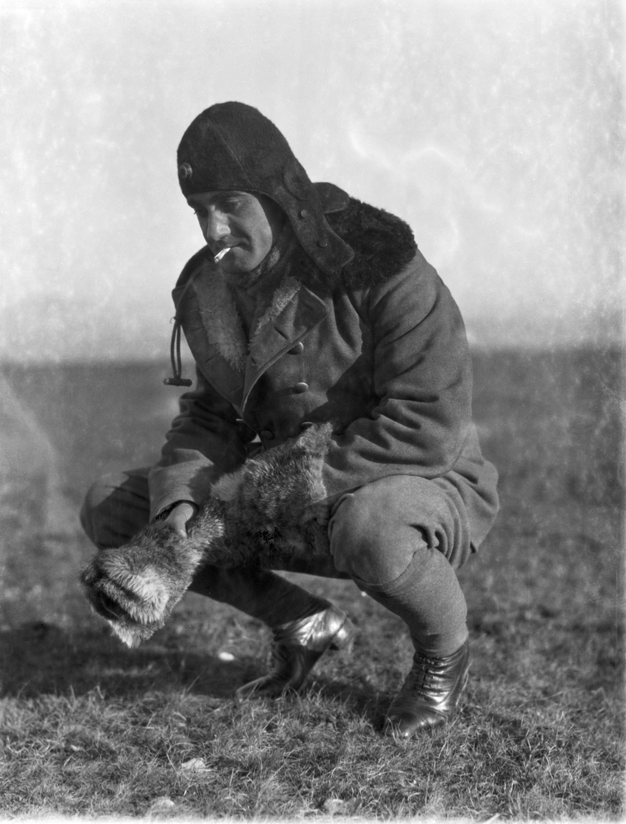 En flygare från Österrike-Ungern sitter på huk på ett flygfält under första världskriget. Med en cigarett i munnen.