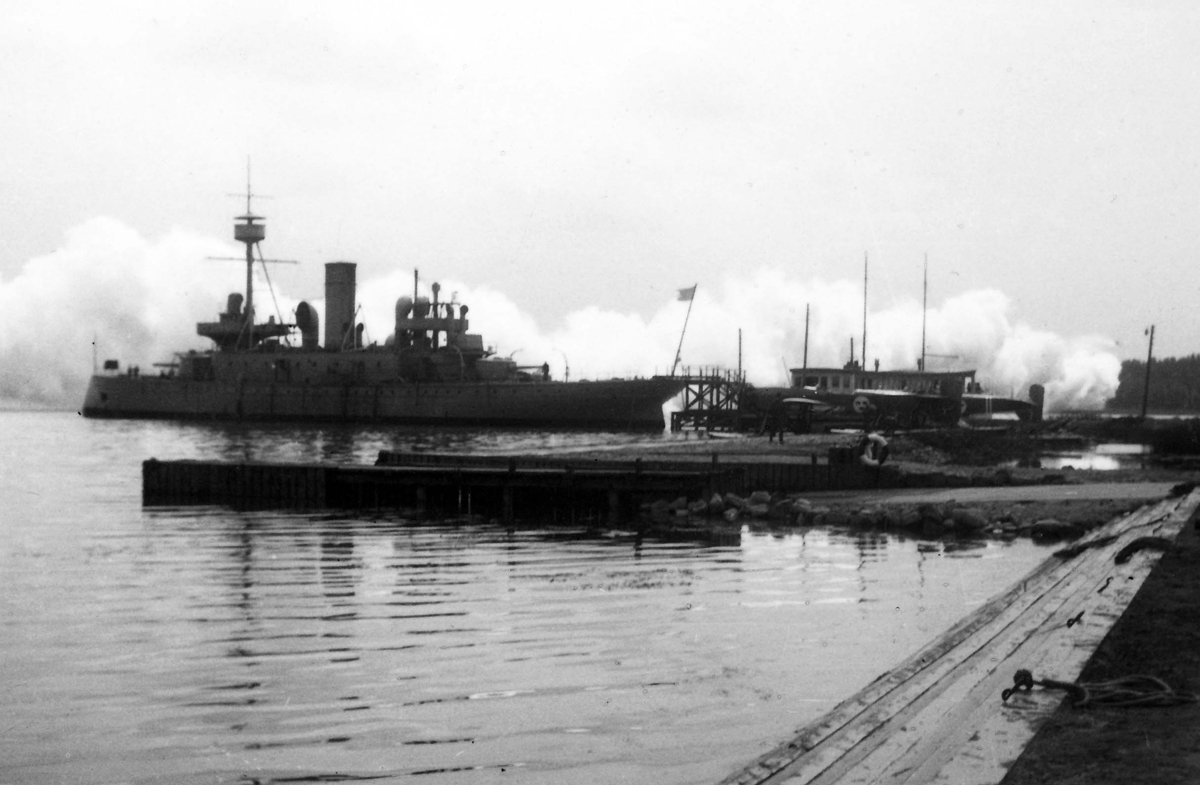 Vy över hamnområde med marinfartyget Dristigheten vid kaj och ett militärt sjöflygplan. I bakgrunden syns ett stort moln över vattenytan. 1930-tal.