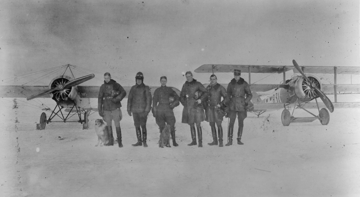 Grupporträtt. Sex stycken militära flygare och två hundar framför flygplan Thulin K och Triplanet på flygfältet på Flygkompaniet på Malmen, vintertid, 1918. Från vänster: Gösta D:son Carlson, Gustaf von Segebaden, Nils Rodéhn, Paul af Uhr, flygspanare B. T. Kjelldahl, Fredrik Adilz.