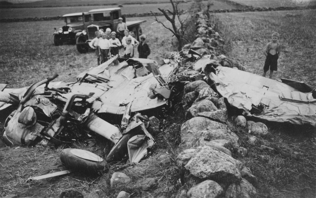 Resterna av ett havererat flygplan ligger över en stenmur på en åker. En grupp barn har samlats bredvid planet. I bakgrunden står två bilar.