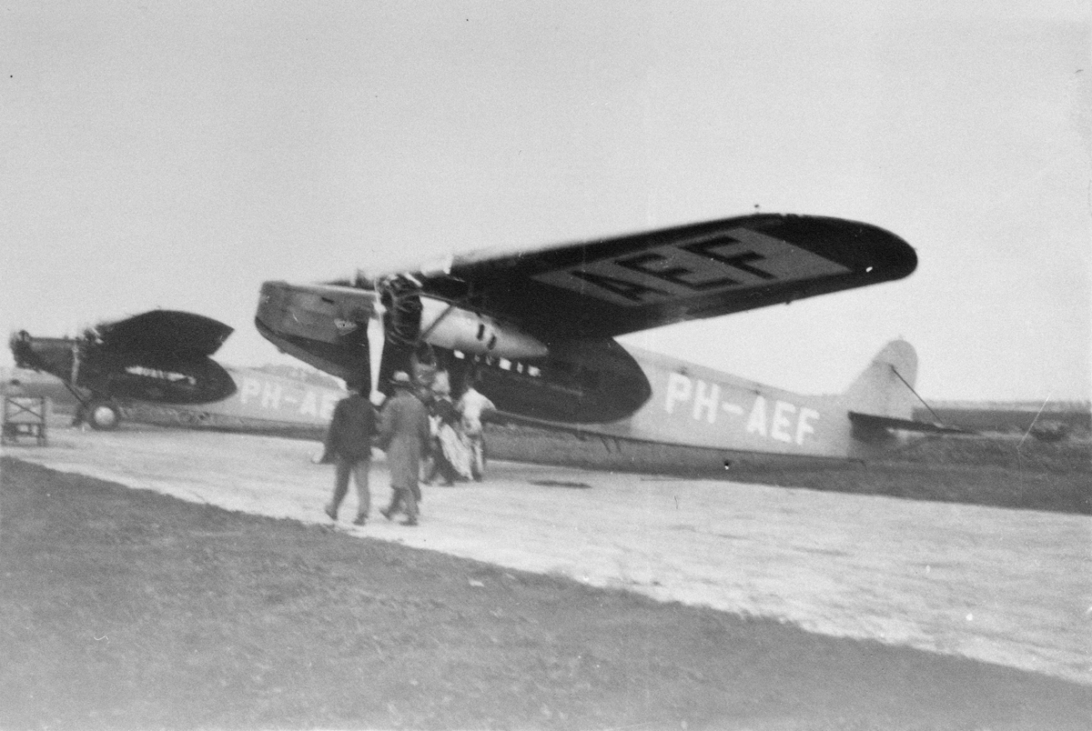 Två civila transportflygplan Fokker F.VIII tillhörande KLM står på ett fält, omkring 1928-1936. Ett av dem med civilregistrering PH-AEF. Folksamling vid planen.