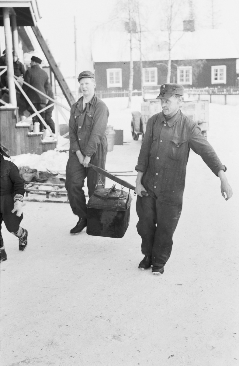 Mattransport vid Svenska frivilligkåren i Finland, F 19. Två militärer bär en stor matkantin.