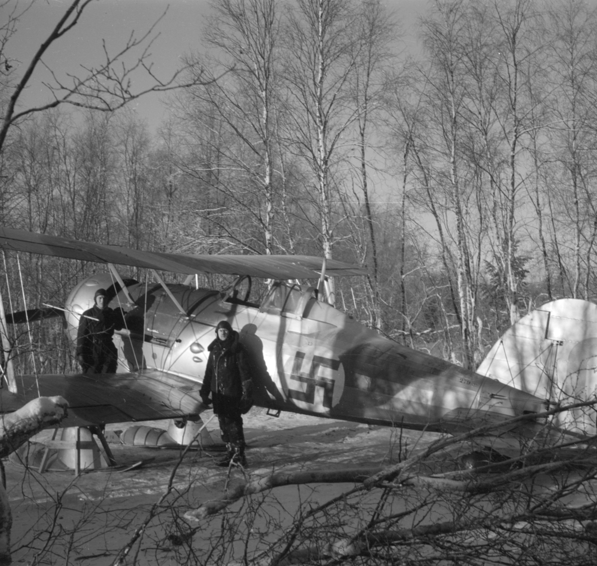 Flygplan Gloster Gladiator märkt G vid F 19, Svenska frivilligkåren i Finland. Oidentifierad militär samt flygförare Arne Frykholm vid flygplanet. Vy snett bakifrån.