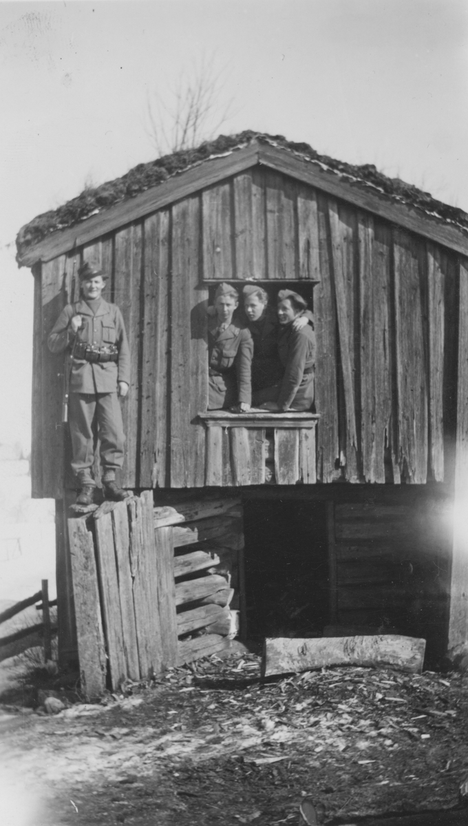 Fyra friviliiga luftbevakare från landstormsregemente L 2 i Dalsland under beredskapstiden vid en fäbod.