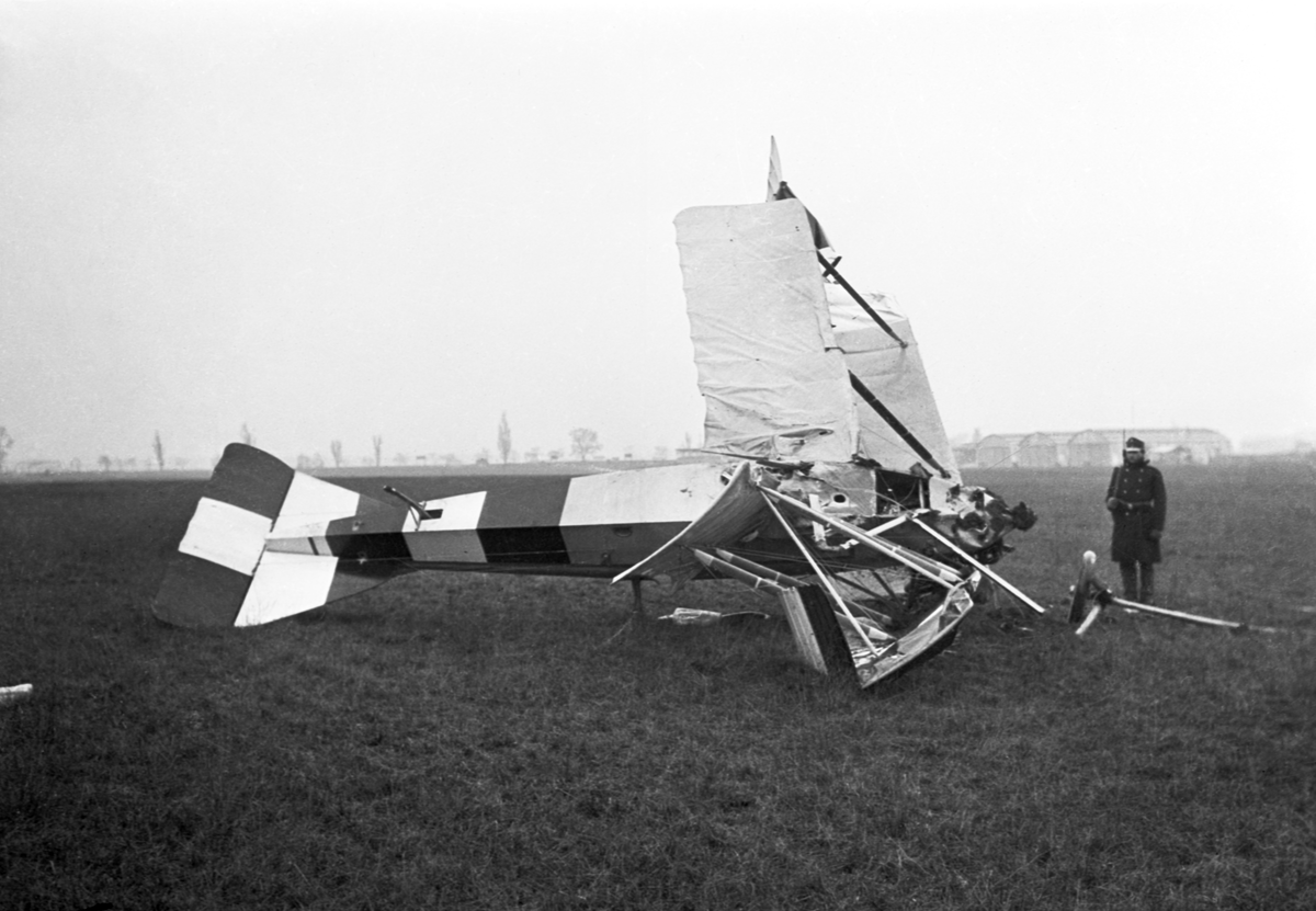 Havererat militärt flygplan Lohner B.VII tillhörande Österrike-Ungern ligger på ett flygfält. En militär står vakt vid flygplanet. Hangarer i bakgrunden. Vy från sidan.