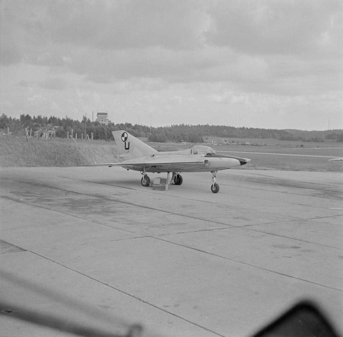 Provflygplan Saab 210 Lilldraken står på flygfältet på F 8 Barkarby.