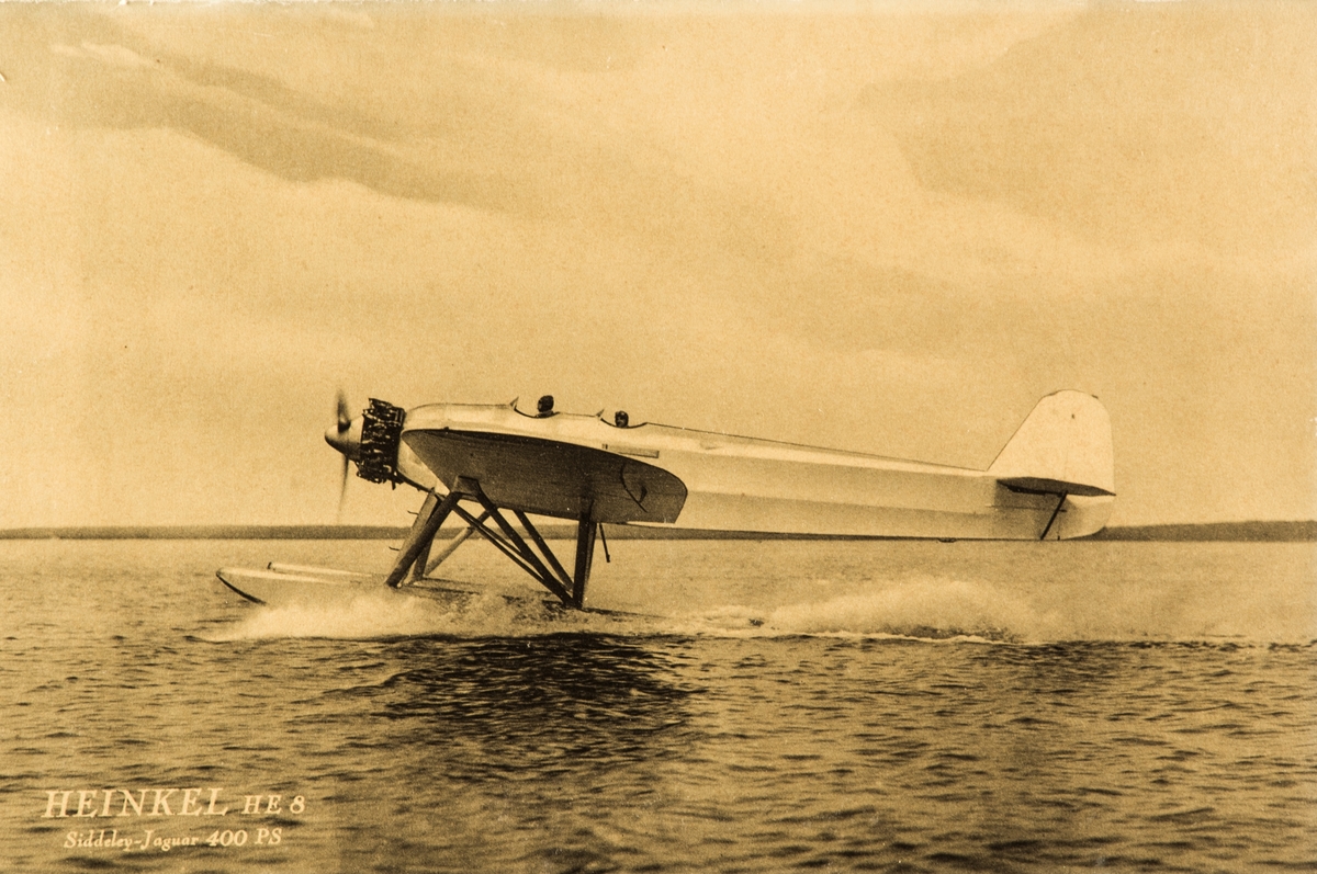 Flygplan Heinkel HE 8 landar på vatten. Med motor Siddeley-Jaguar 400 PS. Reproducerat foto.