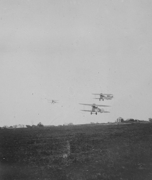 Fyra stycken flygplan Phönixjagaren startar från fält. Ett av flygplanen är märkt nummer 949.