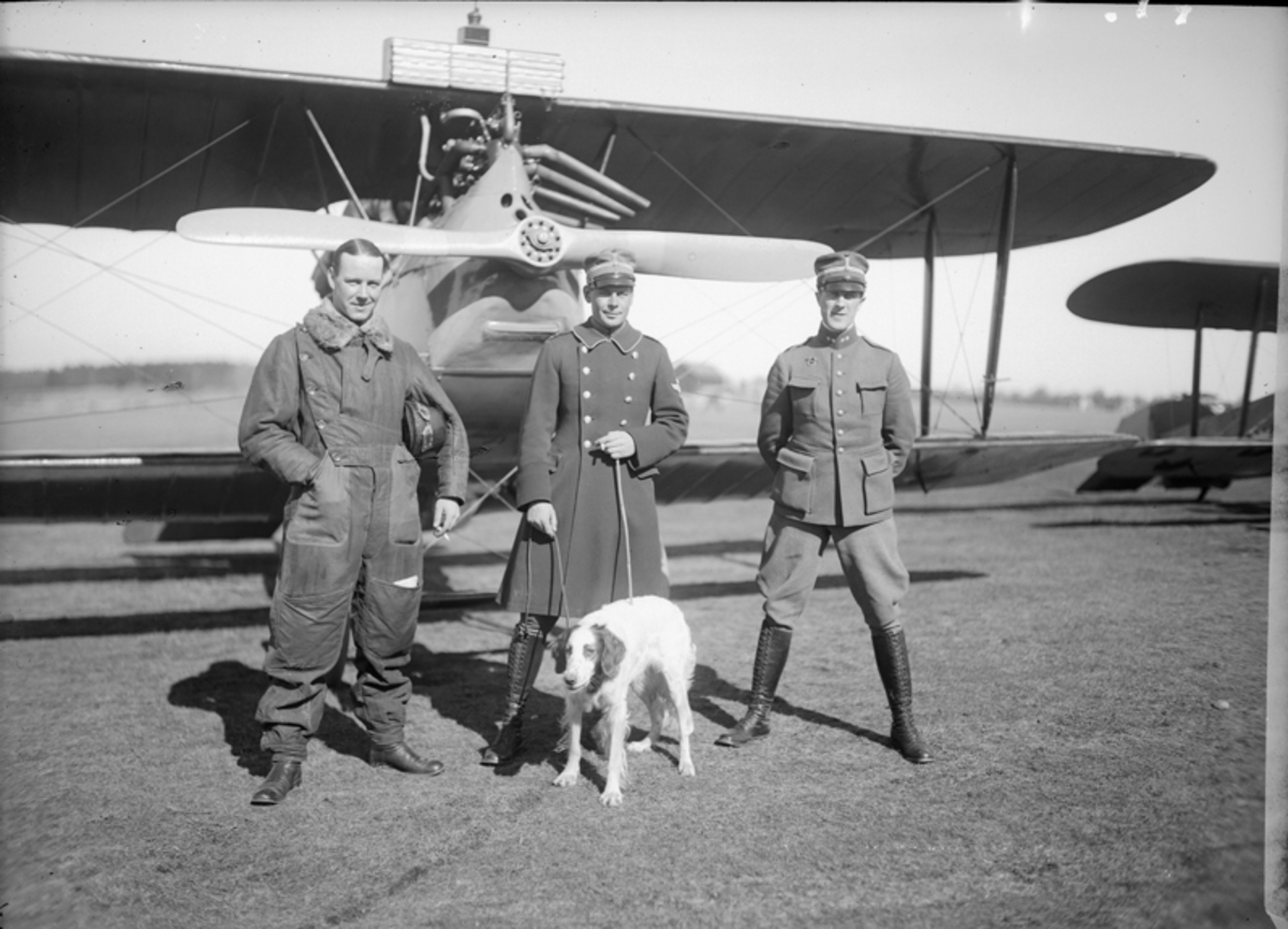 Porträtt av tre löjtnanter och en hund framför flygplan Phönix C.I. på Malmen.