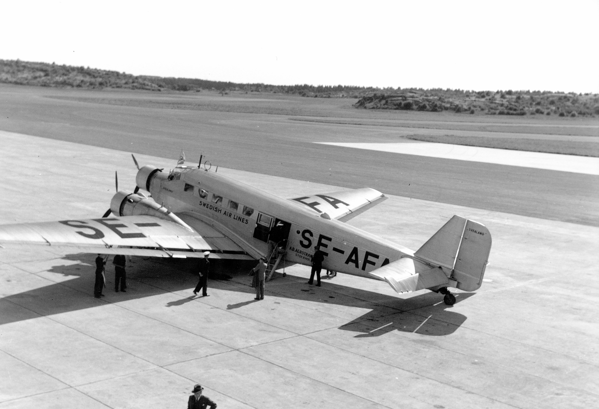 Civilt passagerarflygplan Junkers Ju 52 nummer SE-AFA tillhörande AB Aerotransport på Bromma flygpla