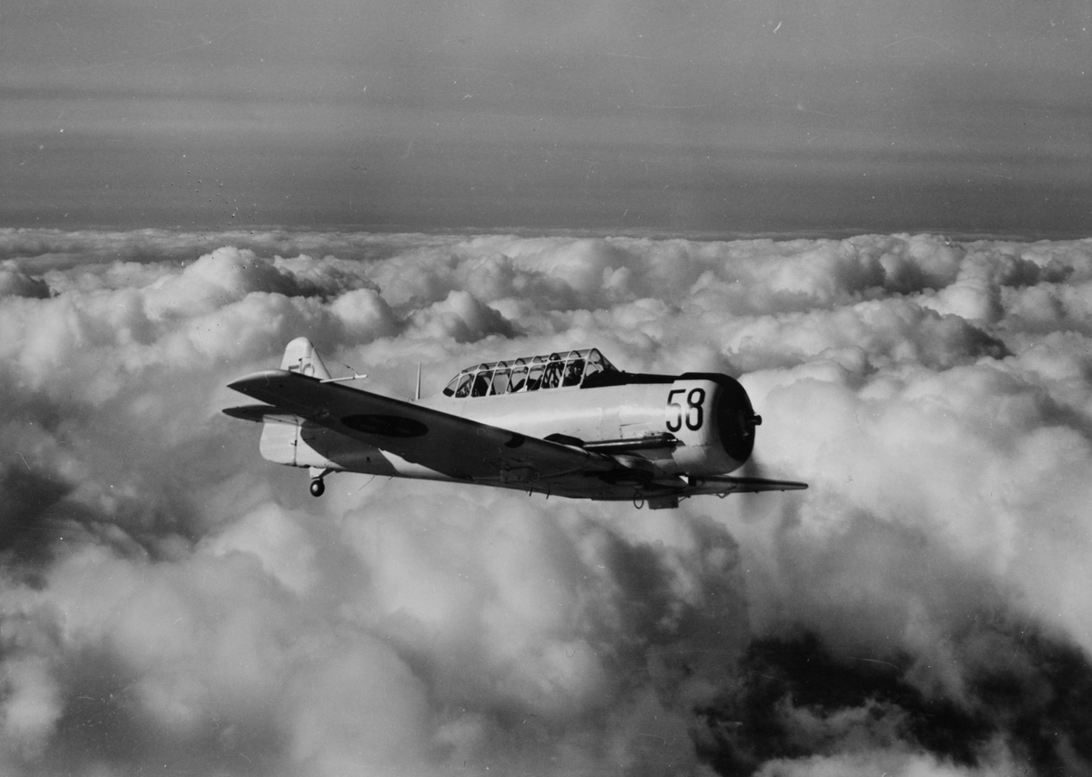 Flygplan SK 16 märkt nummer 58 flyger över moln. Flygplan tillhörande Krigsflygskolan F 5. Sett snett framifrån.
