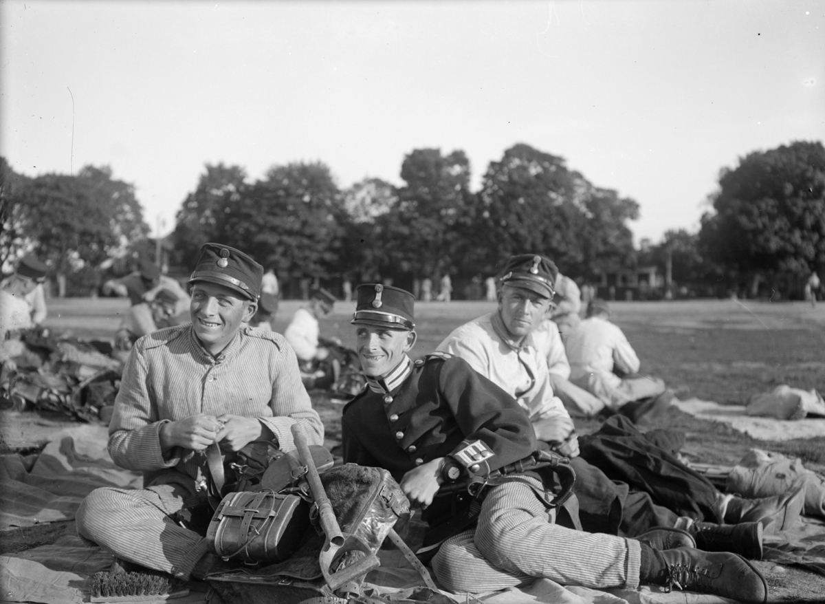 Grupporträtt. Tre armésoldater från I 4 och / eller I 5 regemente vårdar persedlar på lägerområdet på Malmen.
