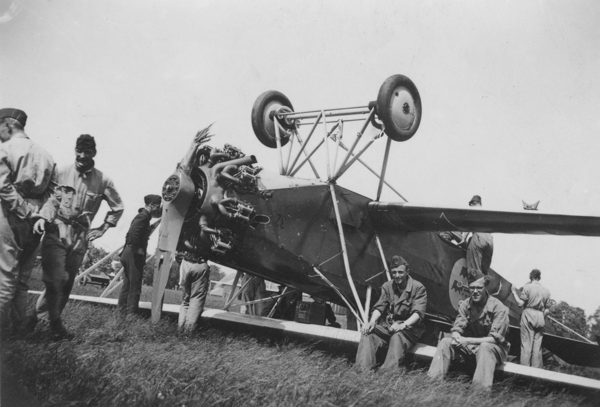 Haveri av flygplan S 6. Flygplanet har landat på rygg på ett fält. Flygvapenpersonal vid planet.