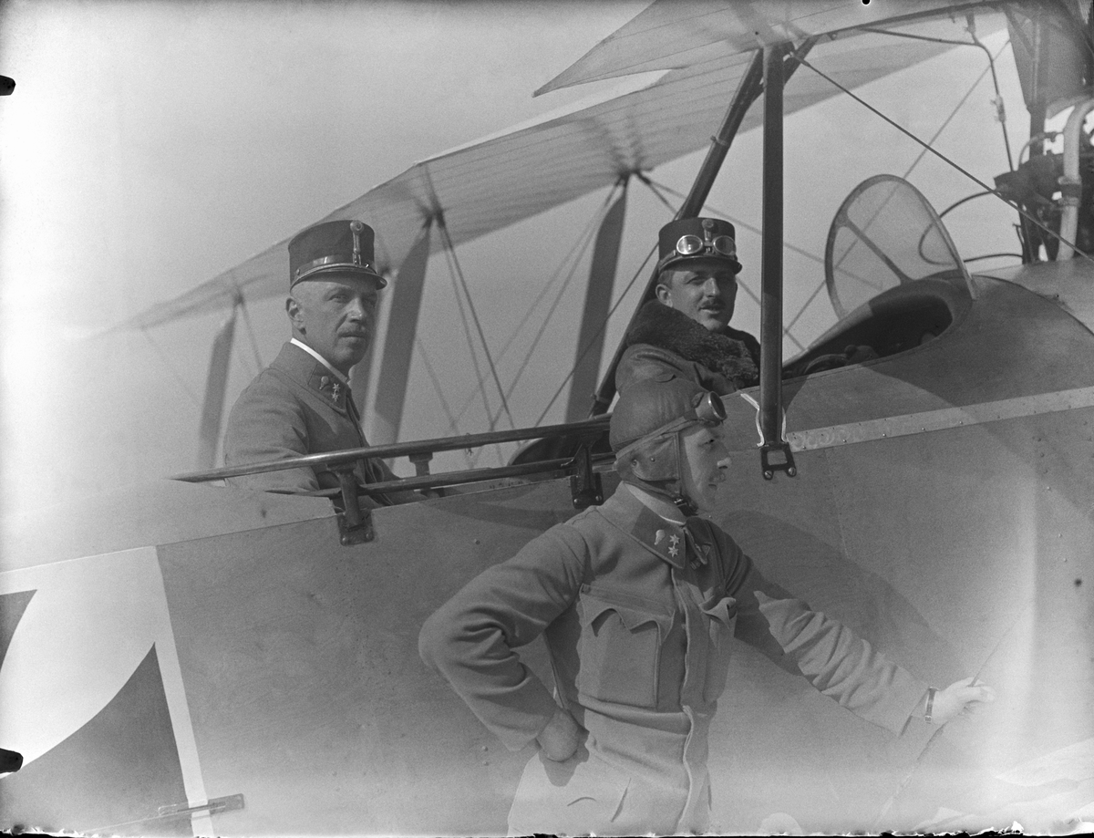 Tre militära flygare vid miltärt flygplan tillhörande Österrike-Ungern under första världskriget. Vy från sidan.