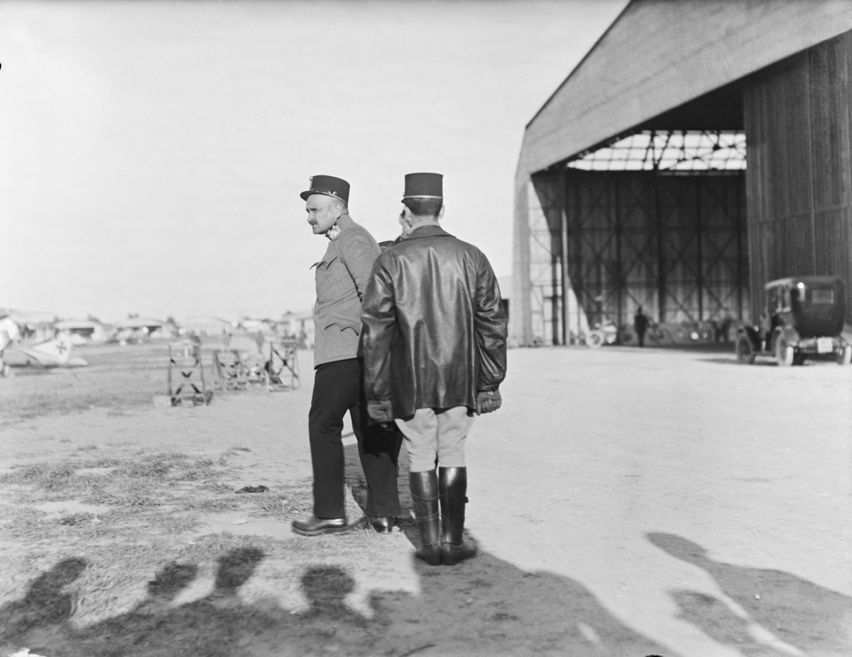 Två militärer från Österrike-Ungern står på ett flygfält. I bakgrunden flygplan och flyghangarer Under första världskriget.