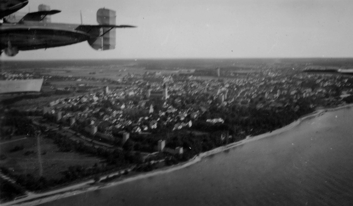 Flygbild av strandlinje vid stad. Till vänster syns två flygplan S 5 flygandes i roteformation. 1930-tal.