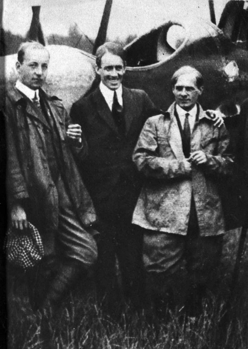 Grupporträtt av tre män framför en flygplan Phönix Dront på Malmen, omkring 1920. Edmund Sparmann till vänster och Max Perini till höger. Oidentifierad man i mitten.