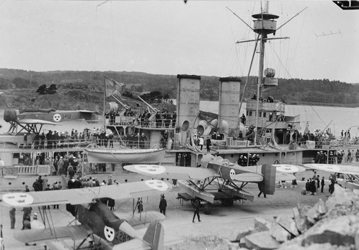 Öppet hus på marinfartyg vid kaj. På fartyget samt framför det står flygplan S 5. Ett flygplan J 4 står i förgrunden, längst till vänster. Människor i rörelse på fartyget.