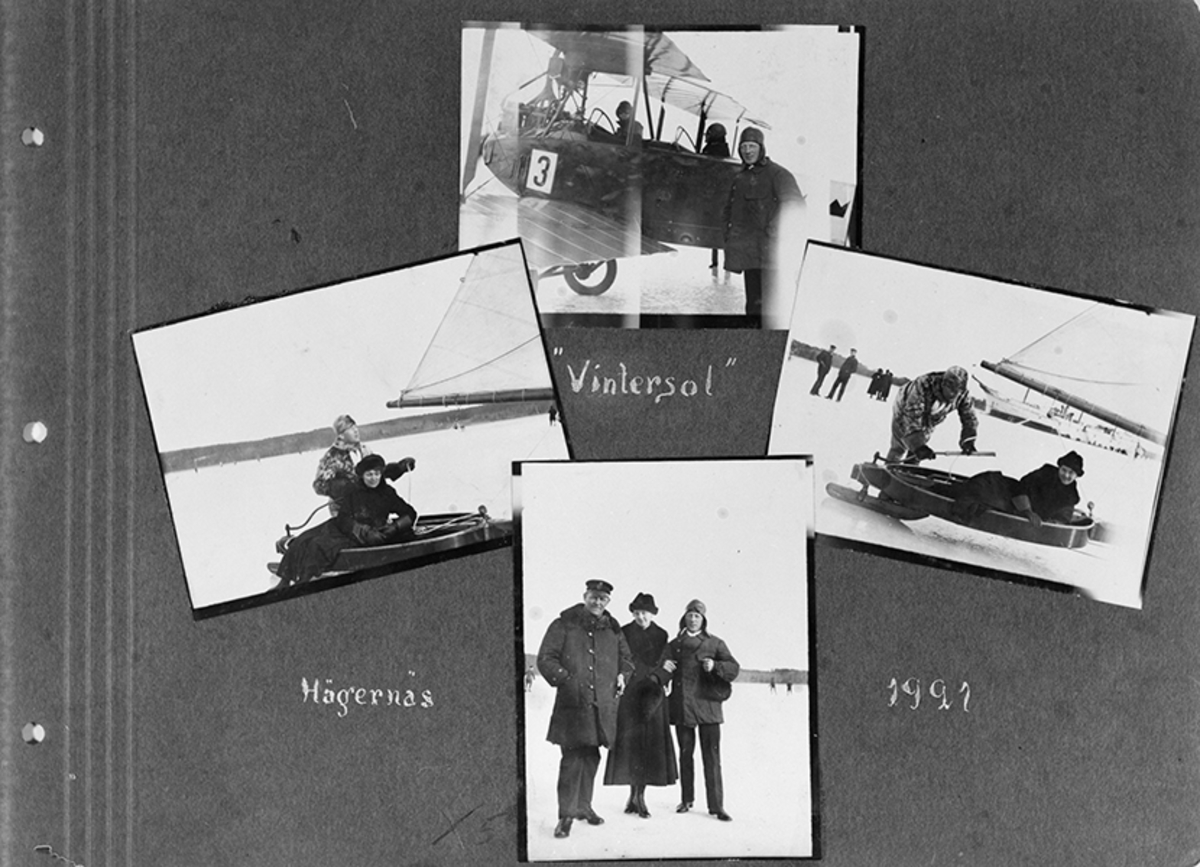 Kollage. Avfotografering av en albumsida med fyra monterade foton tagna på Hägernäs. Överst flygplan Albatros B IIa märkt nr. 3. Två bilder med motiv av isjakt. Nederst en kvinna tillsammans med två män.