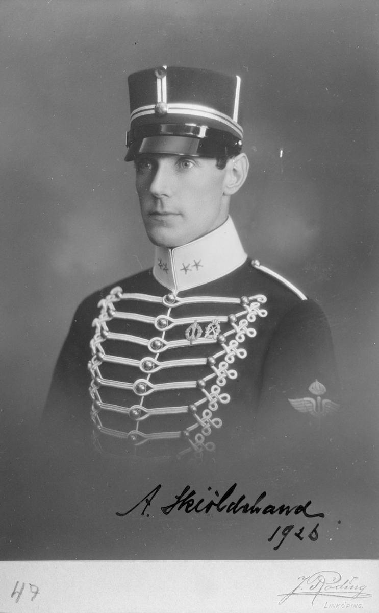 Porträtt av militära flygpionjären Olof Fredrik Archim Skiöldebrand, från Livregementets husarer. Porträttet är signerat av Skiöldebrand.
