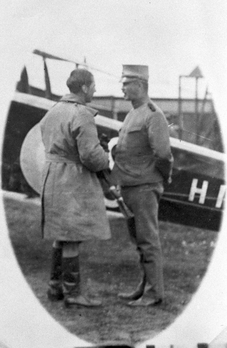 En civilklädd man och chefen för Flygkompaniet, kapten Ernst Fogman står framför flygplan AVRO 504, märkt H1955 på flygfältet på Malmen, omkring 1919-1920. Vy från sidan, sett i profil.