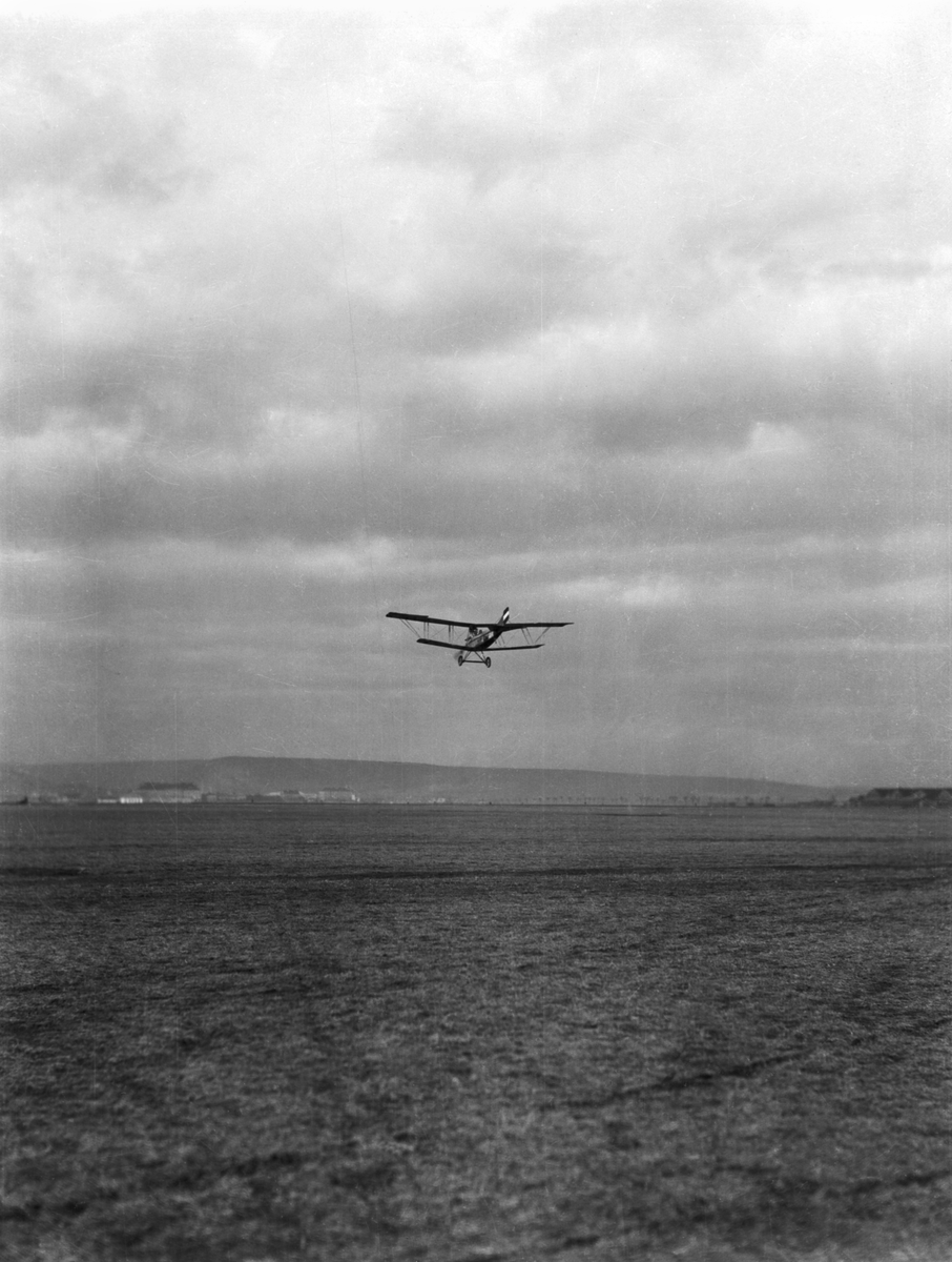 Militärt flygplan Albatros B.I tillhörande Österrike-Ungern flyger över flygfält. Vy bakifrån. Högt berg i bakgrunden.