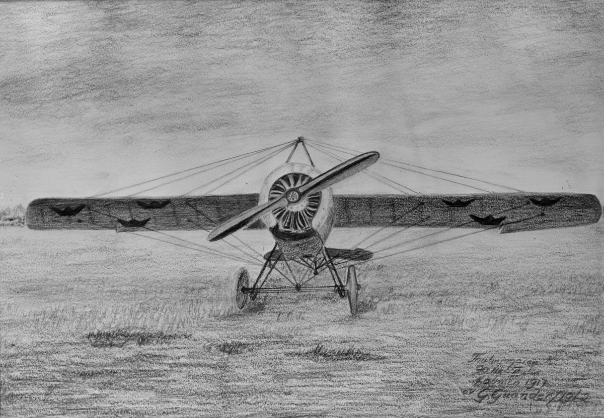 Tecknat flygplan Thulin K med skevroder ur Flygkompaniet. Avfotograferad teckning.