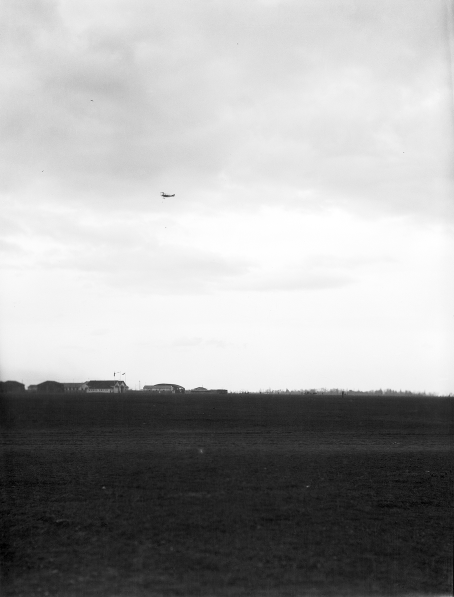 Militärt flygplan Albatros tillhörande Österrike-Ungern i luften över flygfält. Byggnader i bakgrunden.