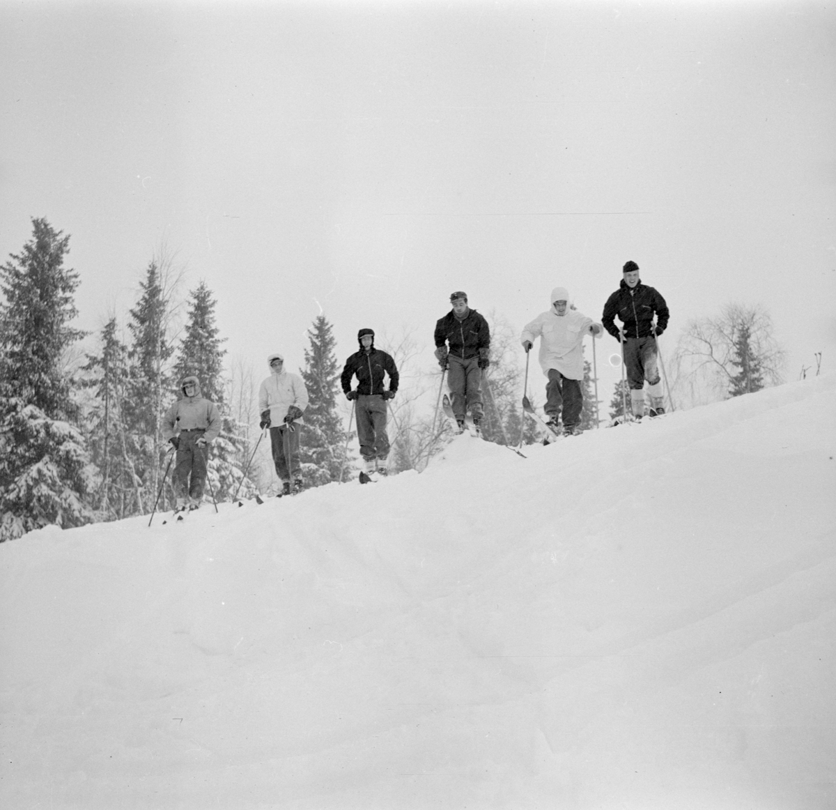 Skidåkning i backe vid F 19, Svenska frivilligkåren i Finland. Sex män längst upp i en backe.