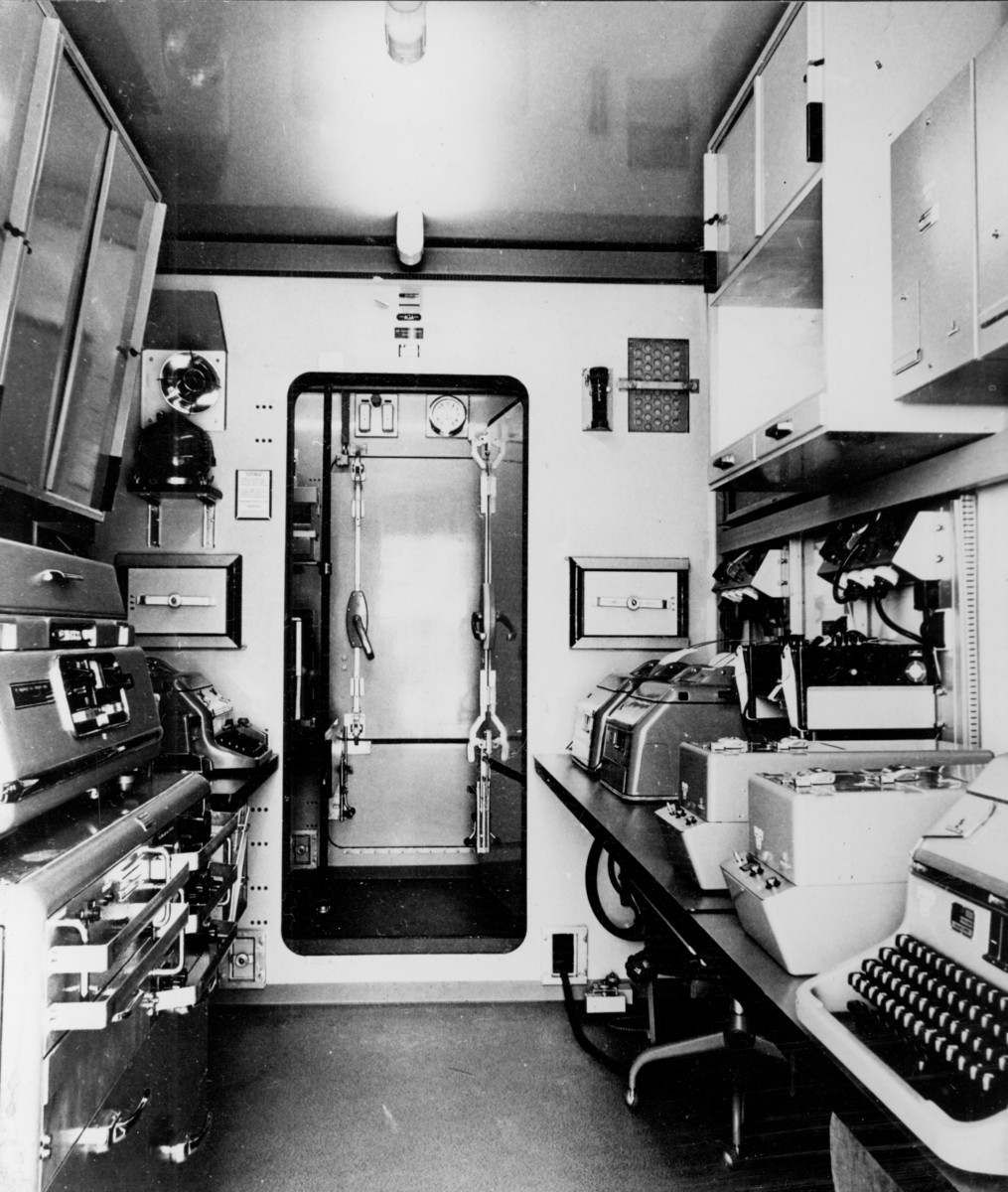 Interiör av signalstationsvagn för Bas-60 i Lopra-systemet (luftoperativa radiosystemet). Försvarets Materielverk utför försök med plasthydda. Interiör av signalstationsvagn, med apparatur.