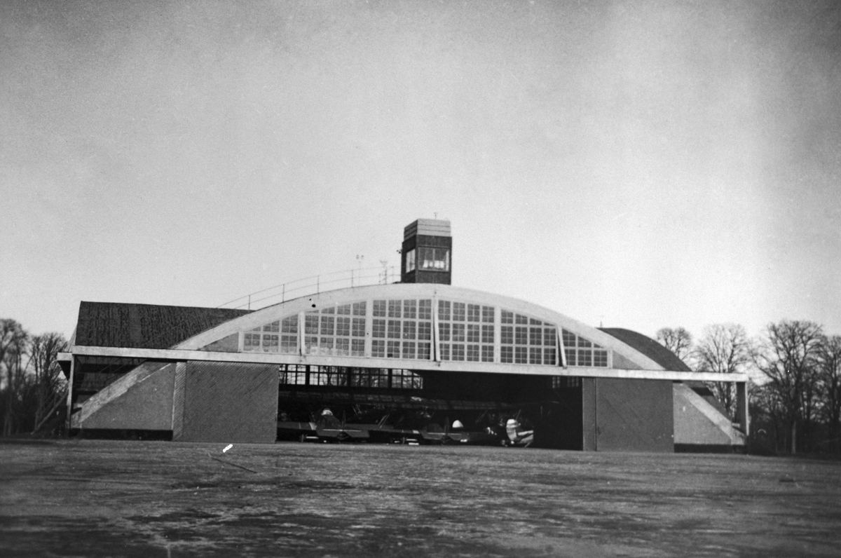Exteriör av hangar 81 på F 3 Östgöta flygflottilj, slutet av 1930-talet. Arkitekt Rudolf Cronstedt.