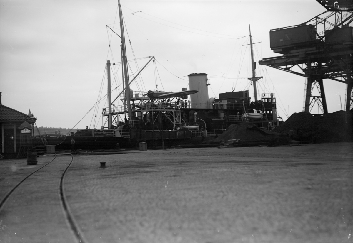 Flygplan S 5 lyfts med kran till ett fartygsdäck. Flygplanet på fartygsdäck.