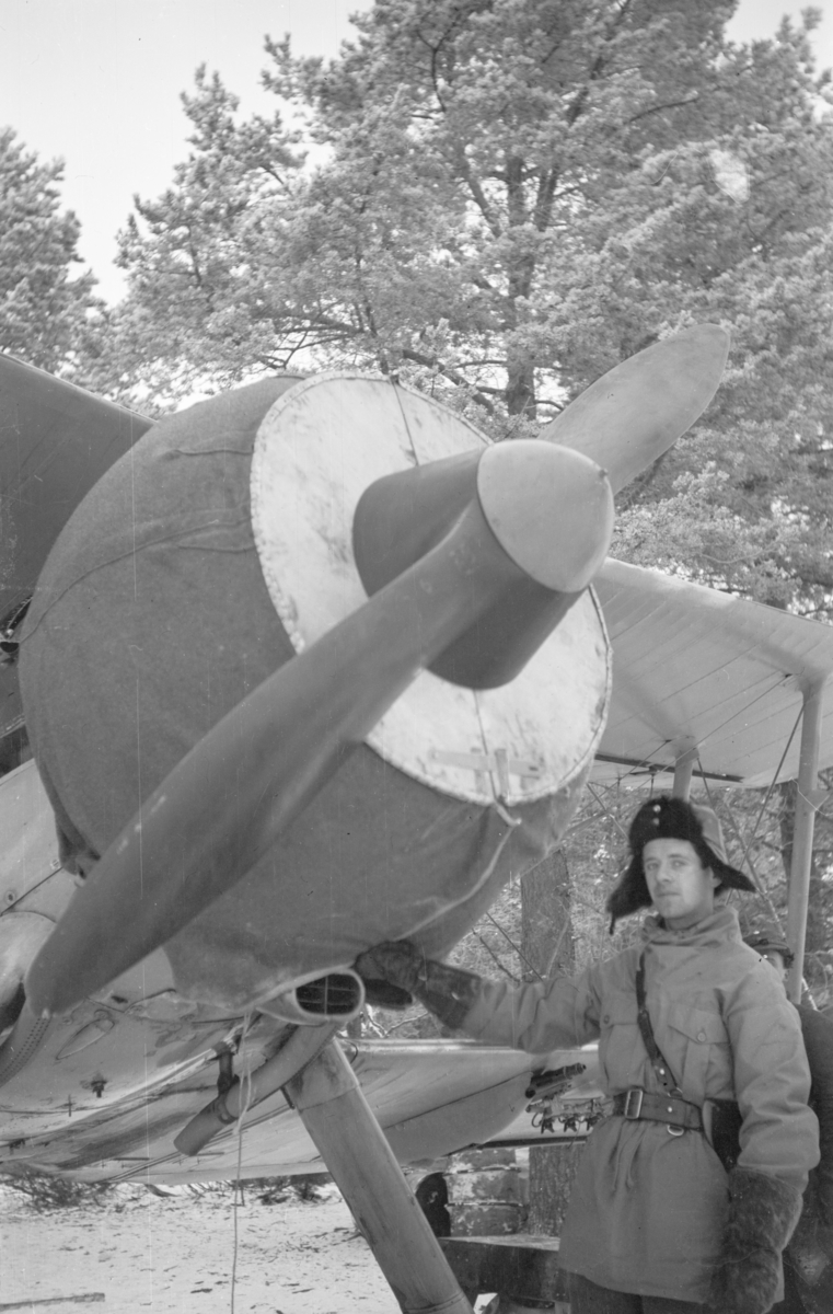 En mekaniker står vid flygplan Gloster Gladiator vid F 19, Svenska frivilligkåren i Finland.