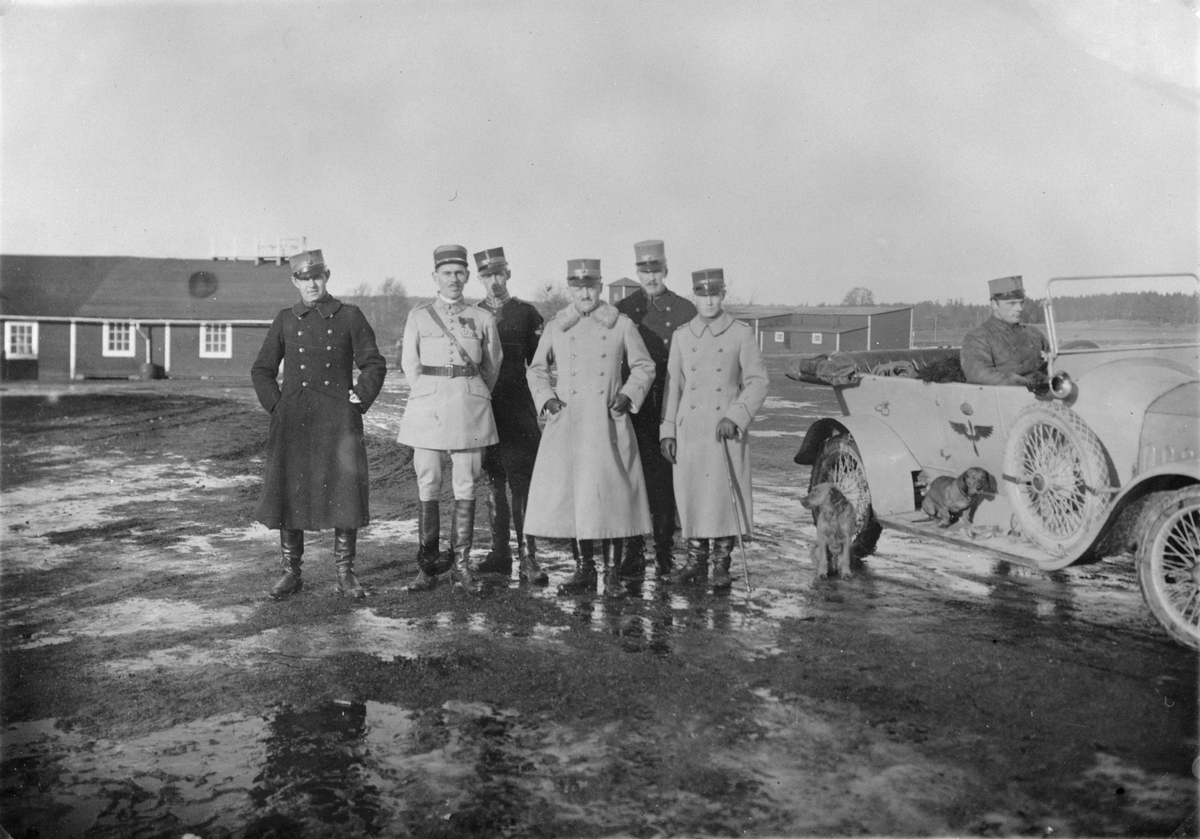 Gruppfoto av militärer på Malmen vid franskt besök, omkring 1917-1920. Från vänster: Gösta von Porat, fransk officer, oidentifierad, Karl Amundson, Ernst Fogman. oidentifierad. Flygkompaniets bil med förare och två hundar bredvid.