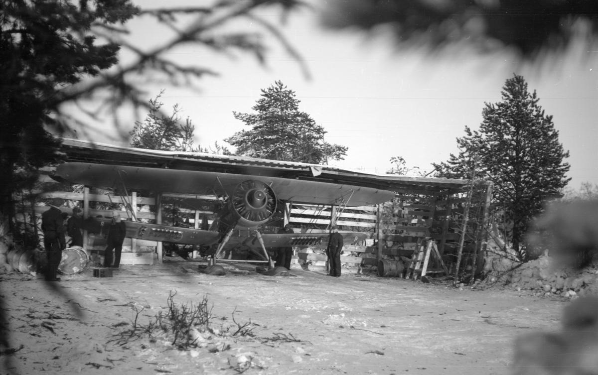 Flygplan Hawker Hart blå R i värn vid F 19, Svenska frivilligkåren i Finland. Flygplanet har påhängda bomber och varmkörs inför start. Fyra militärer i arbete vid flygplanet. I flygplanet sitter Åke Mörne och Hugo Beckhammar.