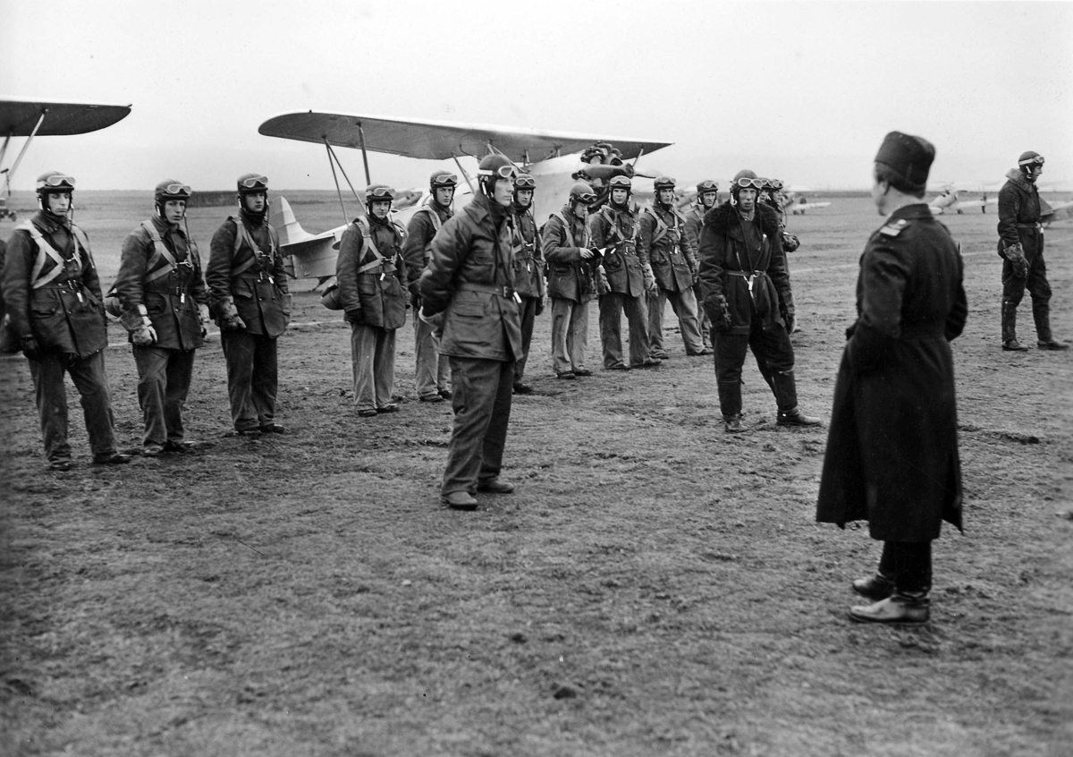 Nils Söderberg ger militära flygare order inför flygning, under 1930-talet. Omkring 15 flygare samlade på ett flygfält framför flygplan S 6. 1930-tal.