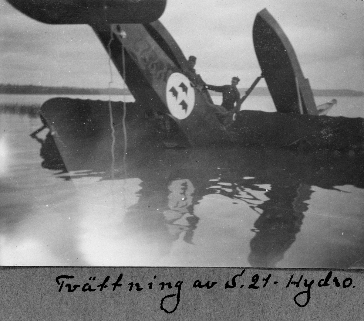 Spaningsflygplan FVM S1 (S.25H), nr 3222 ligger upp och ned vid Nybro, i sjön Roxen, den 28 juni 1927. Vy bakifrån. Två män i arbete vid flygplanet.