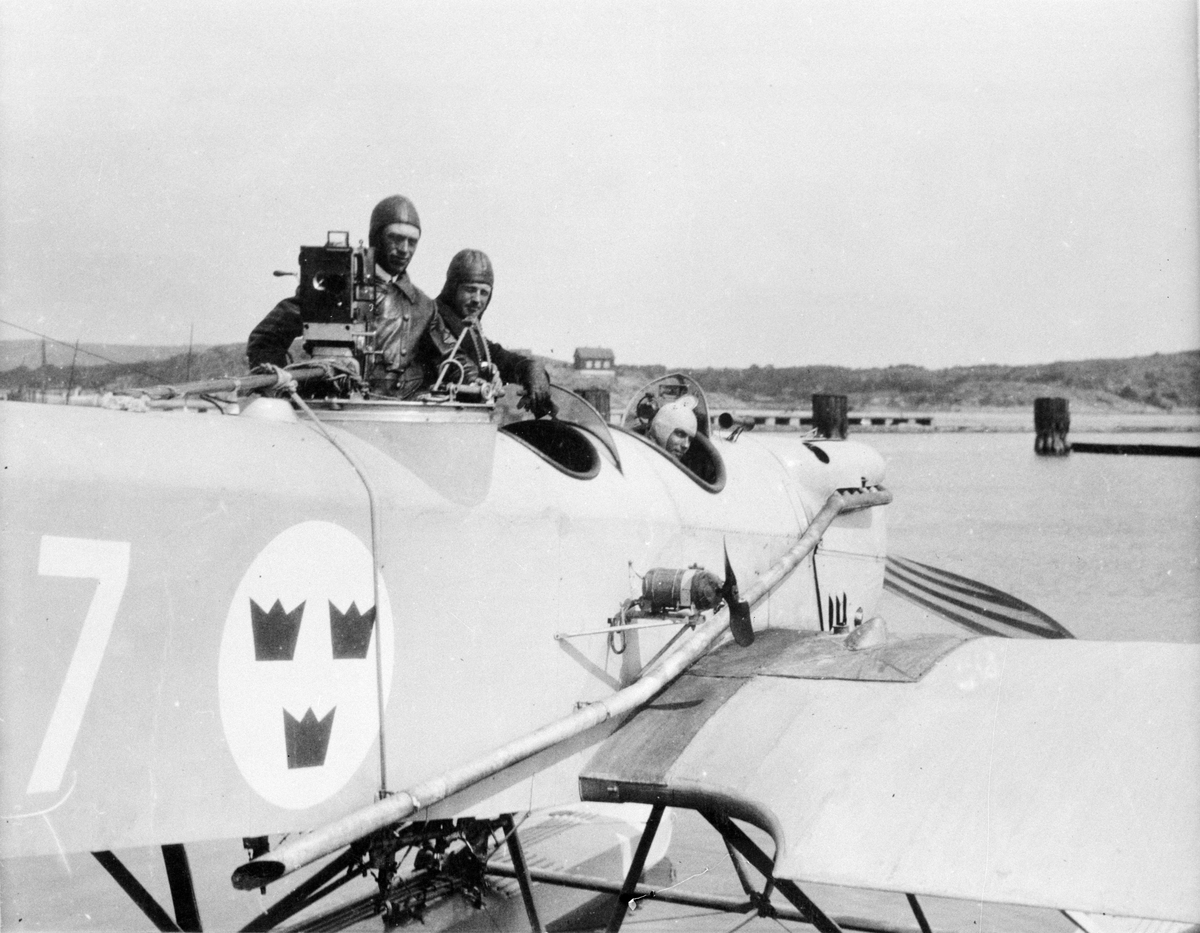 Flygplan S 4, Heinkel HE 4 nr 47 med tremansbesättning, omkring 1927-1930. Spanaren närmast har en spaningskamera. Förtöjd vid brygga.