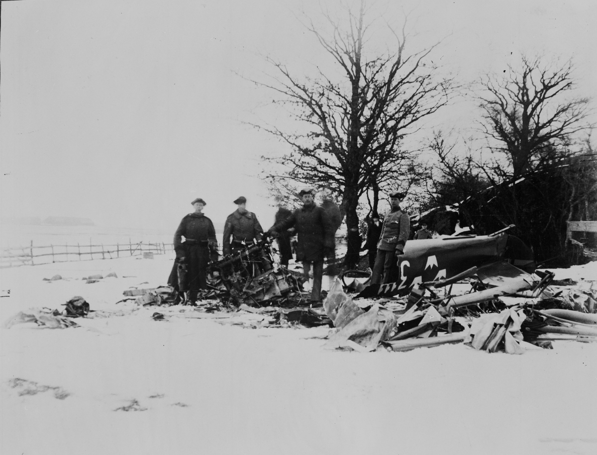 Militärer står vid resterna av flygplan FVM J 23, nr 3111 från Flygkompaniet på Malmen som havererat vid Skäggetorp, 15 mars 1924. Fänrik Karl Axel Norberg omkom.