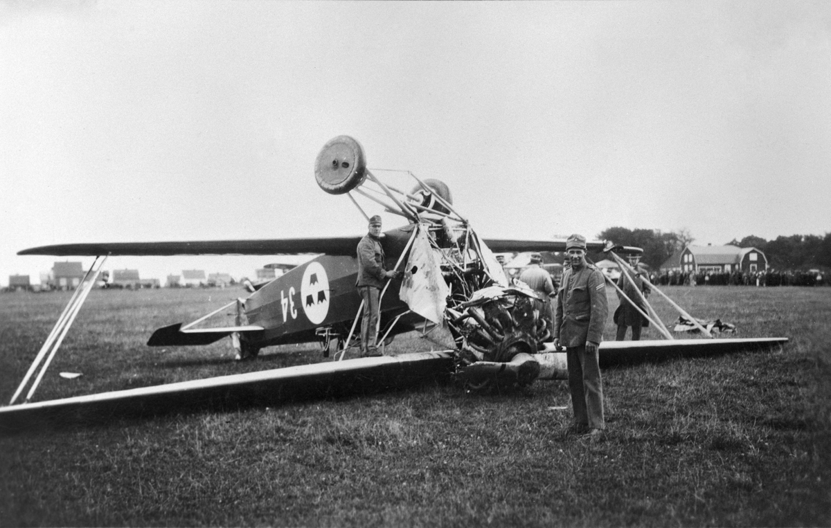 Flygplan S 6, Fokker C.VE nr 34 har landat upp och ned, omkring 1930. Militärer kring flyglanet, folksamling i bakgrunden.