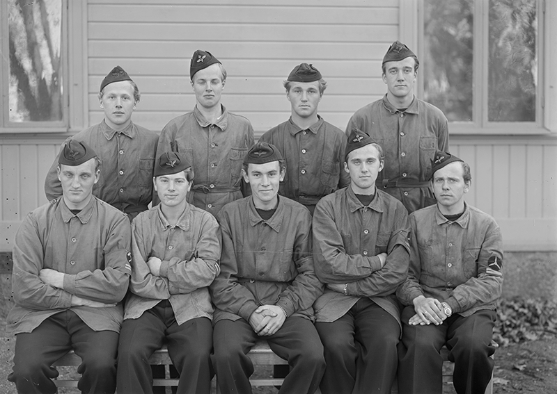 Elever vid furirskolan för flygplansmekaniker på F 3 Östgöta flygflottilj, 1945-1946. Del av klass, nio stycken elever. Grupporträtt framför byggnad.