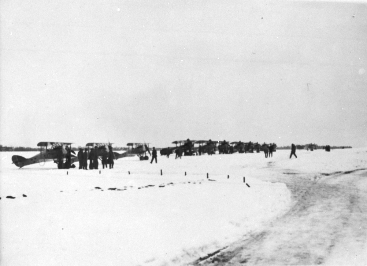 Flygplan Tummeliten och Albatros står på linje på ett flygfält, vintertid. Militärer i rörelse.