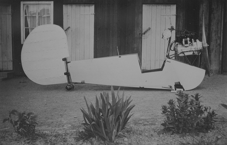 Flygplan Flygande Loppan utan vingar utanför en byggnad. Sidovy.