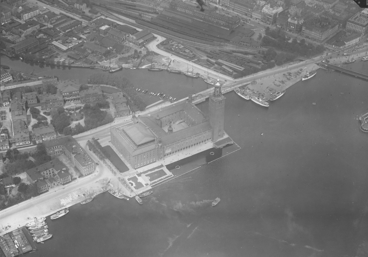 Flygbild av Stockholms stadshus vid slutet av 1920-talet.