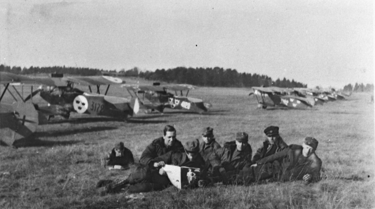Militärer rastar på ett flygfält framför uppställda flygplan Phönix Dront, 1920-tal.