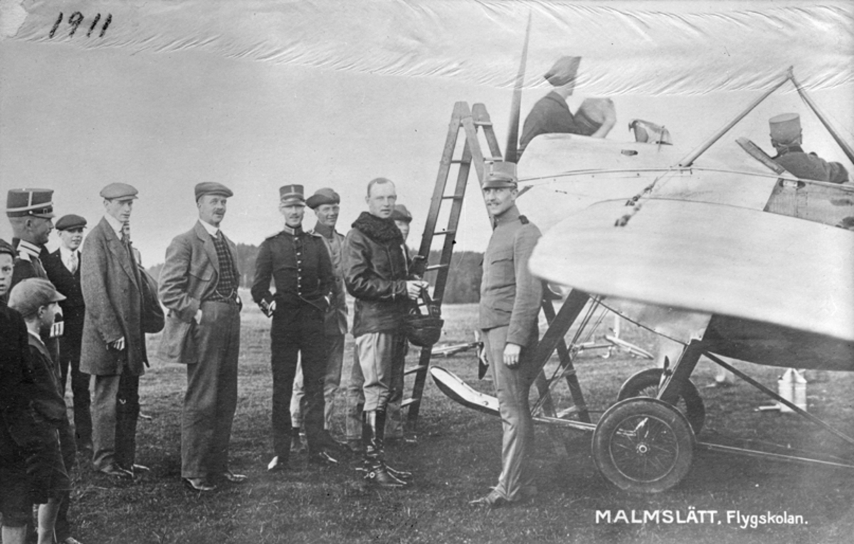 Flygplan M 2 med personer omkring på flygskolan på Malmslätt, 1913.