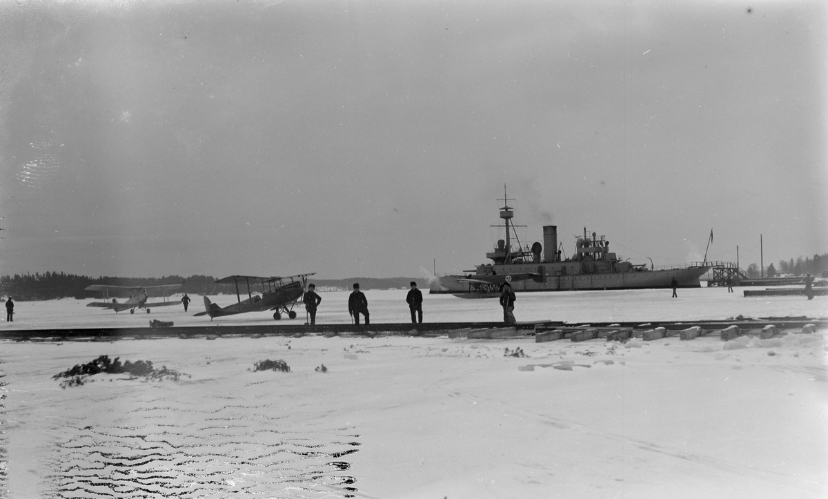 Fyra personer i arbete med rälsslip F 2 Roslagens flygflottilj, vintertid 1935. I bakgrunden syns fartyget HMS Göta samt tre militära flygplan, varav ett är av typen S 5.