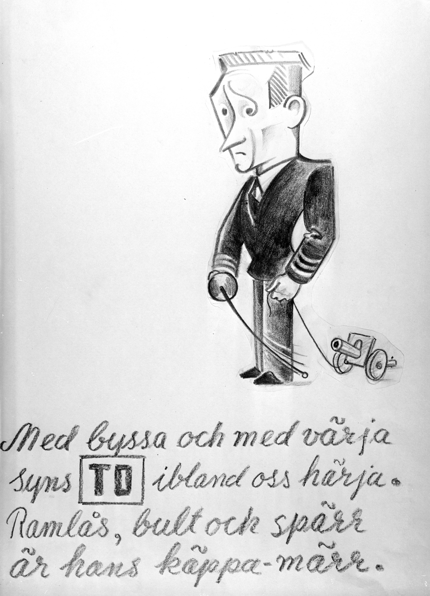 Karikatyrbild av militär ur flygvapnet, 1930-tal. Märkt 'TO'. Avfotograferad teckning.